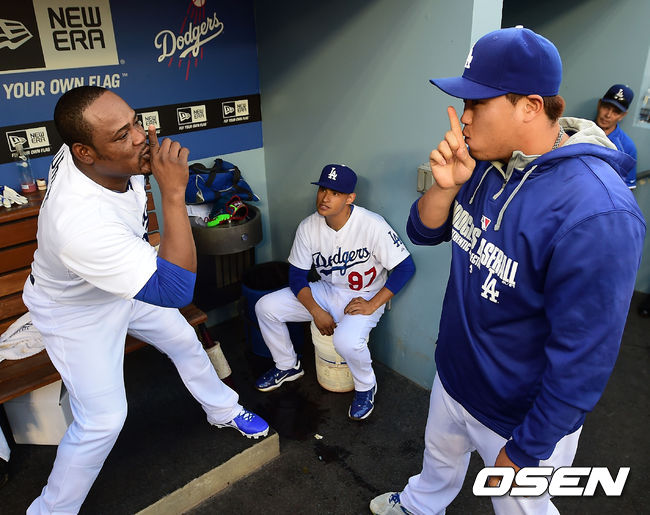 다저스 유리베와 류현진이 세레머니를 하고 있다.