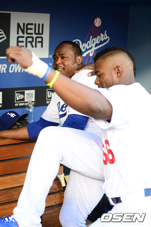 다저스 유리베와 푸이그가 장난을 치고 있다.