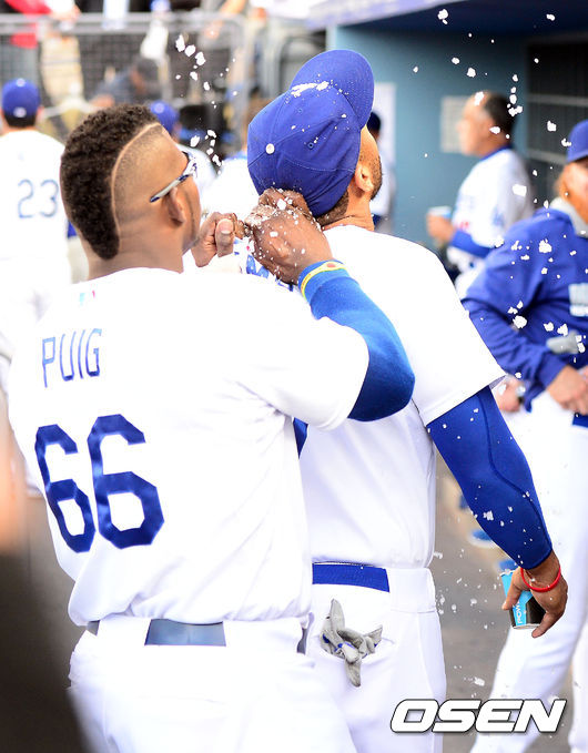 다저스 푸이그가 켐프에게 장난을 치고 있다.
