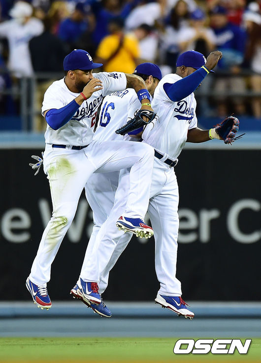 승리를 거둔 다저스 켐프, 이디어, 푸이그가 기뻐하고 있다./youngrae@osen.co.kr