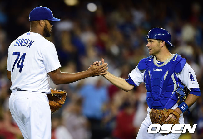 승리를 거둔 다저스 젠슨과 부테라가 기뻐하고 있다./youngrae@osen.co.kr
