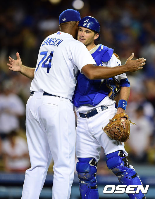 승리를 거둔 다저스 젠슨과 부테라가 기뻐하고 있다./youngrae@osen.co.kr