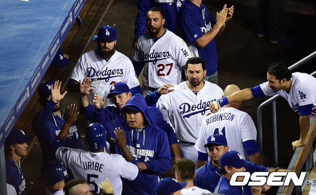 8회말 1사 1,3루 다저스 유리베가 터의 안타로 득점을 올린 뒤 동료들에게 축하받고 있다./youngrae@osen.co.kr