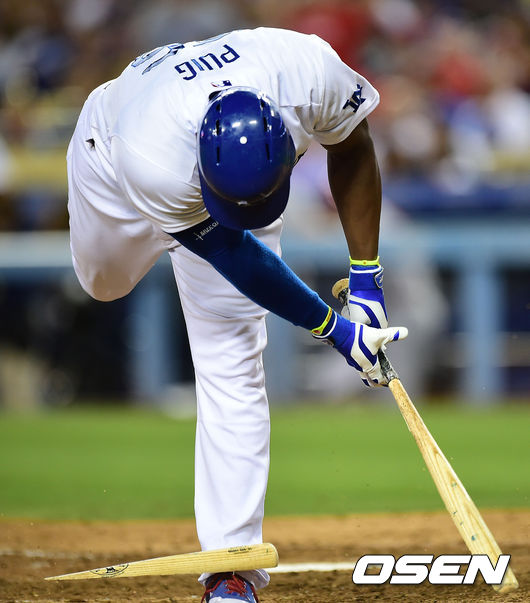 8회말 2사 2,3루 다저스 푸이그가 삼진을 당한 뒤 배트를 부러뜨리고 있다./youngrae@osen.co.kr