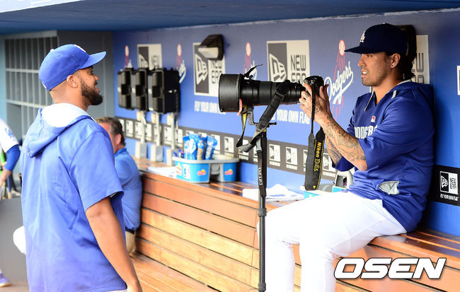 다저스 젠슨과 리그가 이 경기에 앞서 취재진의 카메라를 가지고 장난을 치고 있다./youngrae@osen.co.kr