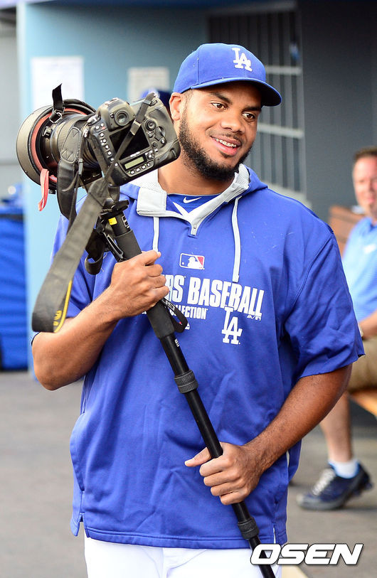 다저스 젠슨이 경기에 앞서 취재진의 카메라를 들고 장난을 치고 있다./youngrae@osen.co.kr