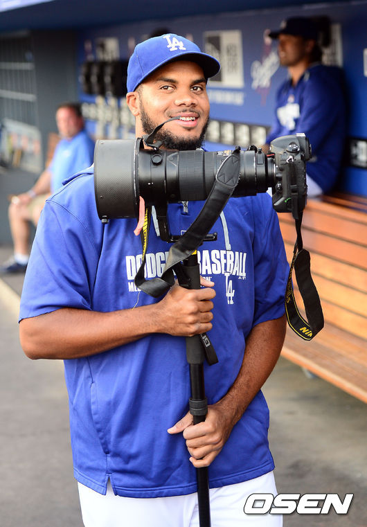 다저스 젠슨이 경기에 앞서 취재진의 카메라를 들고 장난을 치고 있다./youngrae@osen.co.kr