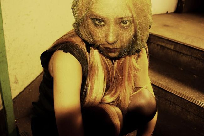 사진 속 크리스탈은 얼굴이 비치는 망을 쓰고 웅크려 앉은 채 강렬한 눈빛으로 카메라 렌즈를 응시하고 있다.