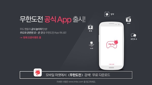 MBC 대표 예능프로그램 '무한도전'의 공식 어플리케이션이 안드로이드의 구글플레이와 아이폰 앱스토어에서 론칭됐다.