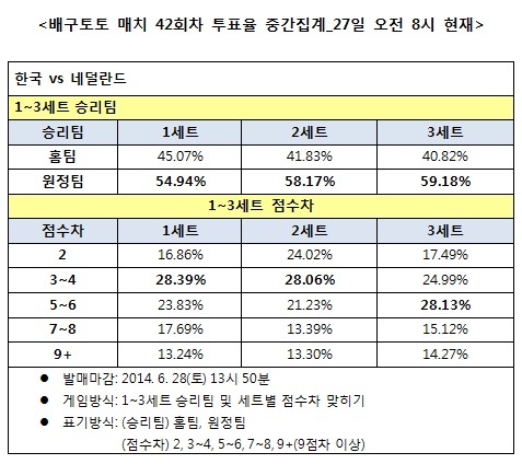 [배구토토] 국민체육진흥공단(www.kspo.or.kr)이 발행하는 체육진흥투표권 수탁사업자인 스포츠토토의 공식 온라인 발매사이트 베트맨(www.betman.co.kr)은 오는 28일 열리는 2014 월드리그 국제남자배구대회 한국-네덜란드전을 대상으로 하는 배구토토 매치 42회차 게임 투표율 중간집계 결과, 배구팬들은 원정팀 네덜란드가 홈팀 한국을 상대로 1, 2, 3세트에서 모두 우세한 경기를 펼칠 것으로 예상했다.