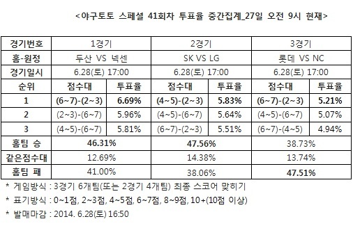 [야구토토] 국민체육진흥공단(www.kspo.or.kr)이 발행하는 체육진흥투표권 수탁사업자인 스포츠토토의 공식 온라인 발매 사이트 베트맨(www.betman.co.kr)이 오는 28일에 열리는 한국프로야구(KBO) 3경기를 대상으로 한 야구토토 스페셜 41회차 투표율을 중간 집계한 결과, 롯데-NC(3경기)전에서 참가자의 47.51%는 NC가 롯데에 승리할 것으로 예상했다.