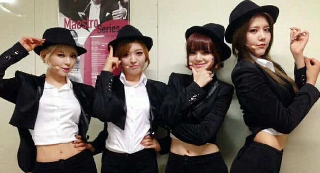사진 속 AOA 멤버들은 검은 정장을 입고 소녀시대의 '미스터 미스터' 안무 포즈를 취하고 있다.