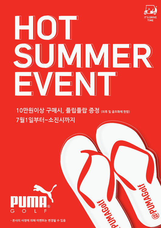 푸마골프의 플립플랍으로 클럽하우스의 개인실내화나 휴가철의 가벼운 신발로 다양한 장소에서 전천후 사용되길 바라는 이번 행사는 7월 1일부터 소진시까지 제공한다. 전국의 푸마골프 매장에서 진행되며, 한정수량으로 진행한다.
