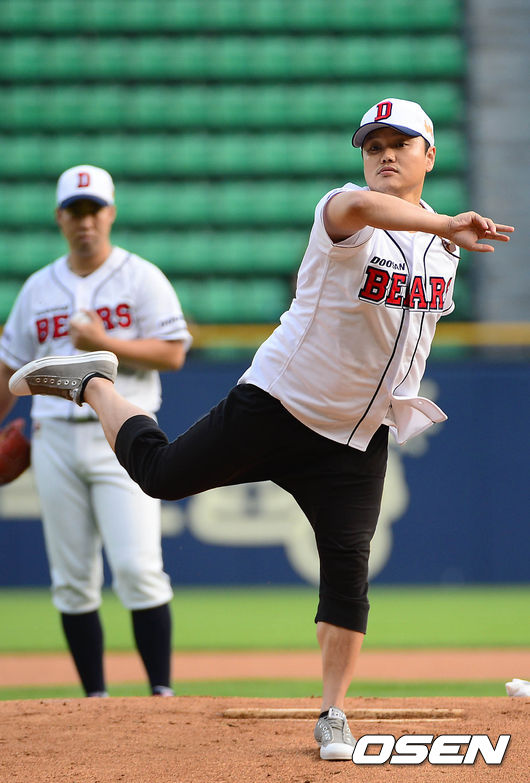 경기에 앞서 배우 김민교가 시구를 하고 있다.