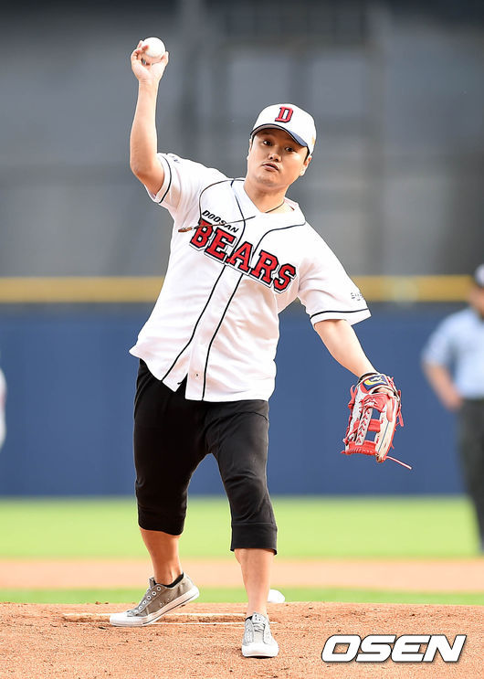경기에 앞서 배우 김민교가 시구를 하고 있다.