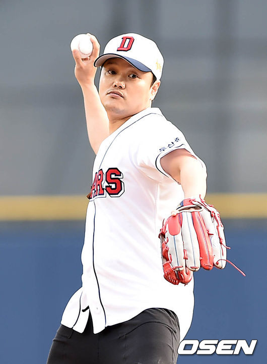 경기에 앞서 배우 김민교가 시구를 하고 있다.