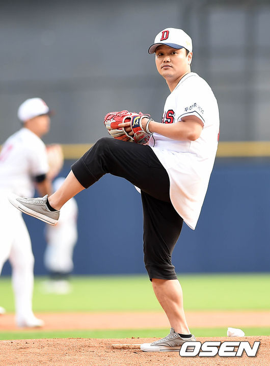 경기에 앞서 배우 김민교가 시구를 하고 있다.
