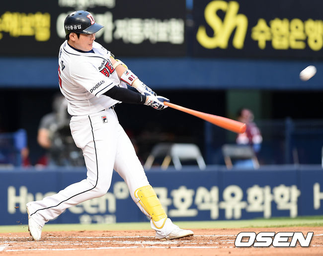 2회말 무사 1루에서 두산 이원석이 좌월 투런 홈런을 치고 있다.