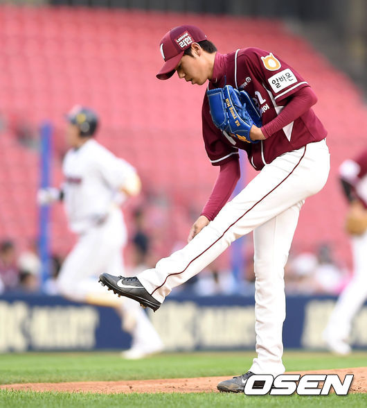 2회말 무사 1루에서 두산 이원석에게 좌월 투런 홈런을 허용한 넥센 하영민이 아쉬운 표정을 짓고 있다.