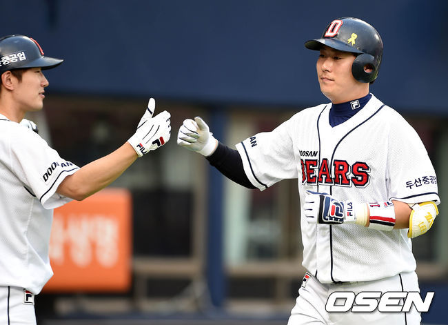 2회말 무사 1루에서 두산 이원석이 좌월 투런 홈런을 치고 홈에서 김재호와 하이파이브를 하고 있다.