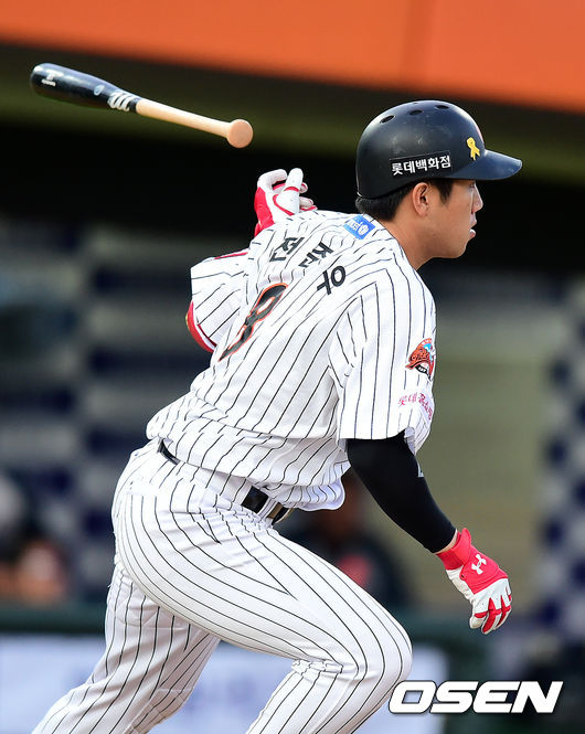 2회말 1사 1,3루에서 롯데 전준우가 적시타를 날리고 있다.