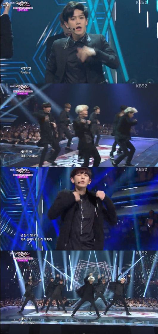 엑소는 27일 방송된 KBS 2TV 음악프로그램 ‘뮤직뱅크’ 상반기 결산 특집에서 ‘중독’을 불렀다. 이들은 검은색 정장을 갖춰 입고 각이 살아 있는 군무로 시선을 끌었다.