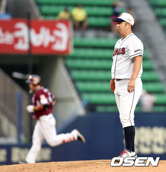 4회초 무사에서 넥센 박병호에게 좌월 솔로 홈런을 허용한 두산 유희관이 아쉬운 표정을 짓고 있다.