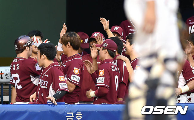 4회초 무사에서 넥센 박병호가 좌월 솔로 홈런을 치고 더그아웃에서 동료들과 환호하고 있다.