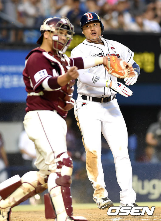 4회말 무사 1,3루에서 두산 이원석의 희생플라이때 3루주자 홍성흔이 태그업을 시도해 득점을 올리며 환호하고 있다.
