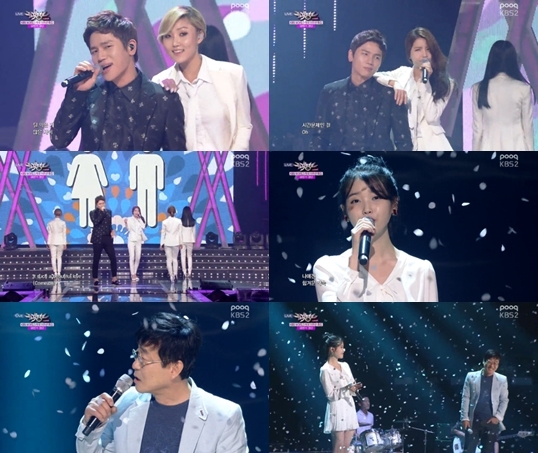 또한 아이유는 김창완과 함께 '너의 의미' 무대를 선보였다. 두 사람은 하얗게 내리는 꽃비를 맞으며 세대를 뛰어넘는 감성호흡을 선보여 눈길을 사로잡았다. 아이유와 김창완의 콜라보레이션은 훈훈함을 자아내 눈길을 끌었다.