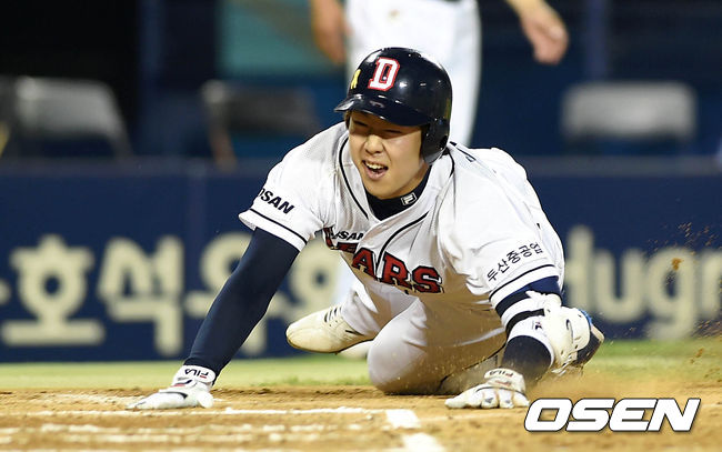 6회말 무사에서 두산 박건우가 좌중간 2루타를 치고 넥센 중견수 이택근의 실책을 틈타 홈으로 쇄도해 득점을 올리고 있다.