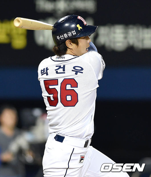 6회말 무사에서 두산 박건우가 좌중간 2루타를 치고 있다.