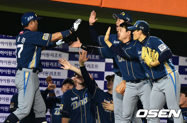 6회초 2사에서 NC 이호준이 솔로포를 날리고 더그아웃에서 동료선수들과 하이파이브를 하고 있다.