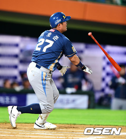6회초 2사에서 NC 이호준이 솔로포를 날리고 타구를 바라보고 있다.