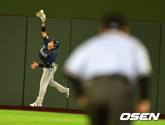 6회말 무사 1루에서 NC 나성범이 롯데 전준우의 펜스에 맞고 나온 타구를 잡으려 안간힘을 쓰고 있다. 전준우는 1타점 적시 3루타.