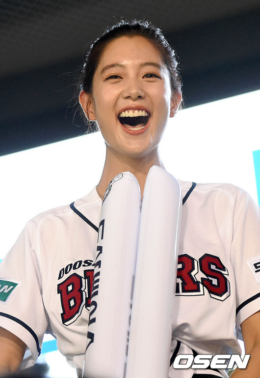 경기장을 찾은 배우 클라라가 환하게 웃고 있다.