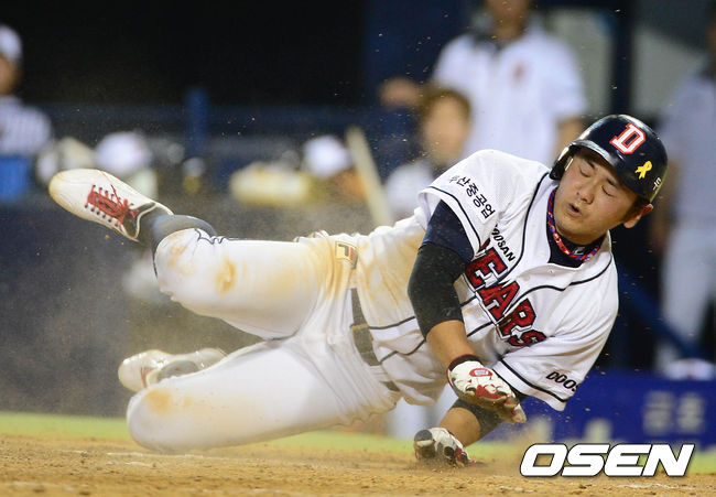 27일 오후 서울 잠실야구장에서 '2014 한국야쿠르트 세븐 프로야구' 두산 베어스와 넥센 히어로즈의 경기, 8회말 2사 주자 1,2루 두산 정수빈 우전 적시타때 홈으로 쇄도한 2루주자 최주환이 득점에 성공하고 있다.