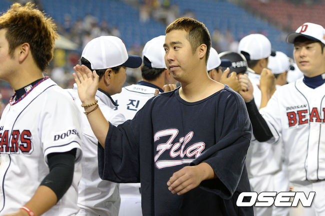 경기 종료 후 두산 유희관이 동료들과 승리의 기쁨을 나누고 있다./sunday@osen.co.kr