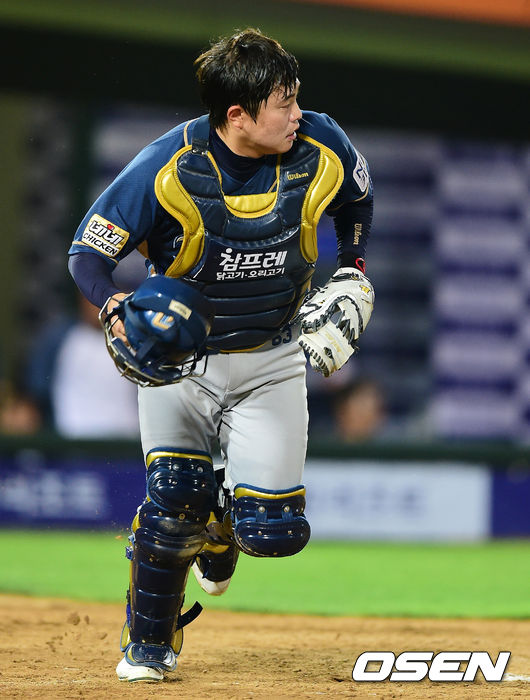 8회말 데뷔 첫 포수 마스크를 쓴 NC 권희동이 2사에서 롯데 박종윤의 2루타에 1루 베이스 커버 들어가고 있다.