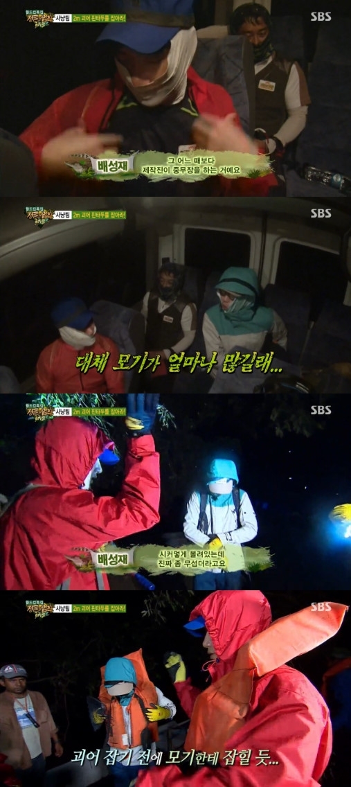 이날 배성재는 김병만, 봉태규와 함께 거대한 괴어 핀타두를 잡기 위해 나섰다. 목적지에 도착하기도 전에 제작진은 버스 안에서 중무장을 했다. 이를 지켜본 병만족도 완전무장에 나섰다. 배성재는 “그 어느 때보다 제작진이 중무장하더라. 뭔가 불길한 생각이 들었다”고 털어놨다.