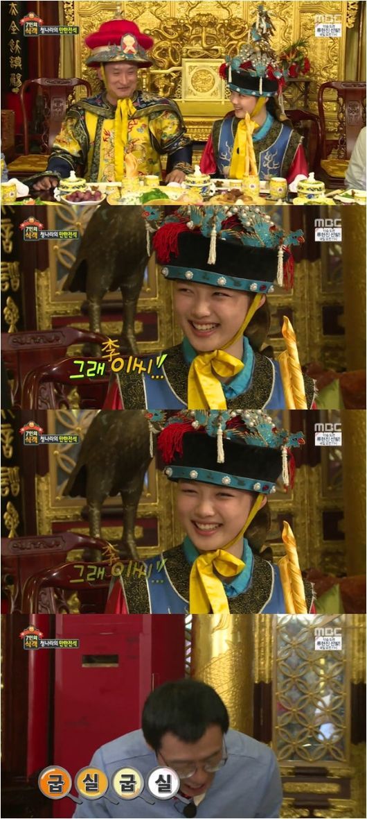 김유정과 서경석은 27일 방송된 MBC 예능프로그램 ‘7인의 식객’에서 청나라 황제가 먹었다는 음식을 먹기 전에 각각 황제와 황후 옷을 입었다.