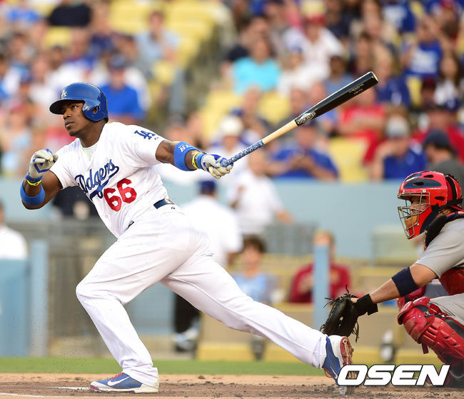 28일(한국시간) 미국 캘리포니아주 로스앤젤레스 다저스타디움에서 열린 '2014 메이저리그' LA 다저스와 세인트루이스 카디널스 경기 1회말 푸이그가 내야안타를 치고 있다.