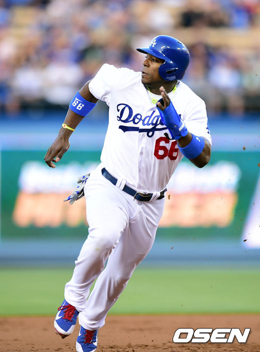 28일(한국시간) 미국 캘리포니아주 로스앤젤레스 다저스타디움에서 열린 '2014 메이저리그' LA 다저스와 세인트루이스 카디널스 경기, 1회말 1사 1루 곤잘레스의 안타때 푸이그가 3루로 달리고 있다.
