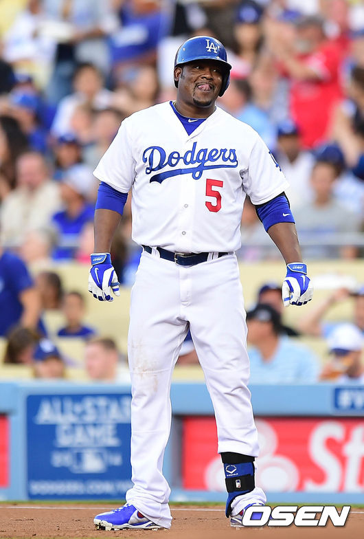 28일(한국시간) 미국 캘리포니아주 로스앤젤레스 다저스타디움에서 열린 '2014 메이저리그' LA 다저스와 세인트루이스 카디널스 경기,1회말 2사 만루서 외야플라이를 친 유리베가 아쉬워 하고 있다.