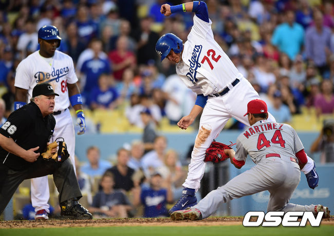 28일(한국시간) 미국 캘리포니아주 로스앤젤레스 다저스타디움에서 열린 '2014 메이저리그' LA 다저스와 세인트루이스 카디널스 경기, 2회말 1사 2,3루 마르티네즈의 투구가 빠진 사이 로하스가 홈을 노렸지만 아웃되고 있다.