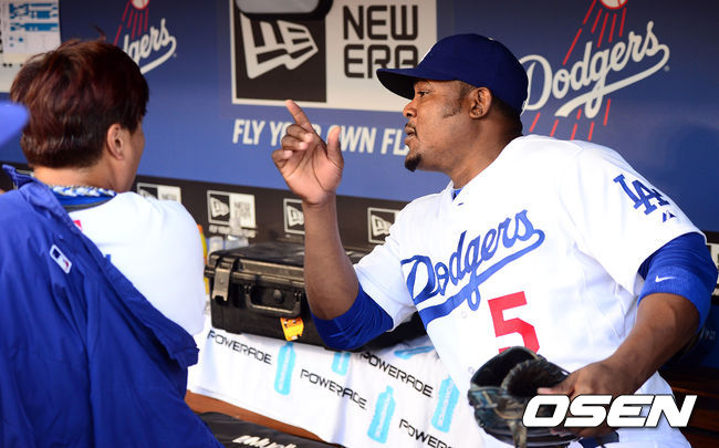 상대 선발 투수 마르티네스에게 3회 데뷔 첫 안타를 허용했던 류현진은 5회 두 번째 타석에서도 중전 안타를 맞았다. 맷 카펜터의 1루 땅볼 때 1루 주자를 2루에서 아웃 시켜 아웃 카운트 하나 늘리고 주자는 1루에 묶기는 했으나 다음 타자 맷 할러데이에게 중전안타를 맞았다. 1사 1,2루. 맷 아담스를 삼진으로 돌려 세우며 다시 아무 일 없이 위기를 넘기나 싶었다. 하지만 조니 페랄타의 타구가 우중간으로 날았다. 다저스 우익수 야시엘 푸이그가 잡기엔 좀 먼 거리. 우중간 빠지는 2타점 적시 2루타가 됐다. 이날 하루 휴식을 얻어 선발 라인업에서 빠진 앙드레 이디어가 중견수였다면 결과가 달라졌을지도 모르는 아쉬움이 남는 장면이었다.