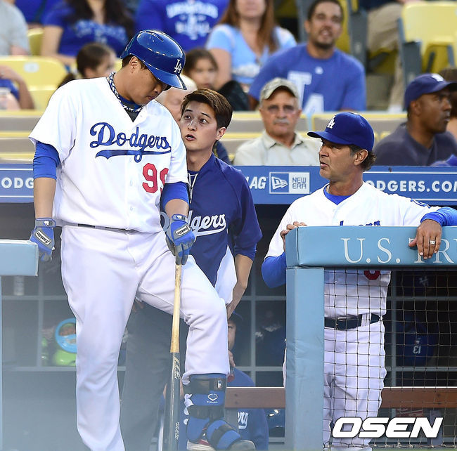 28일(한국시간) 미국 캘리포니아주 로스앤젤레스 다저스타디움에서 열린 '2014 메이저리그' LA 다저스와 세인트루이스 카디널스 경기, 2회말 무사 1,2루 매팅리 감독이 타석에 나가는 류현진에게 페이크번트를 지시하고 있다.