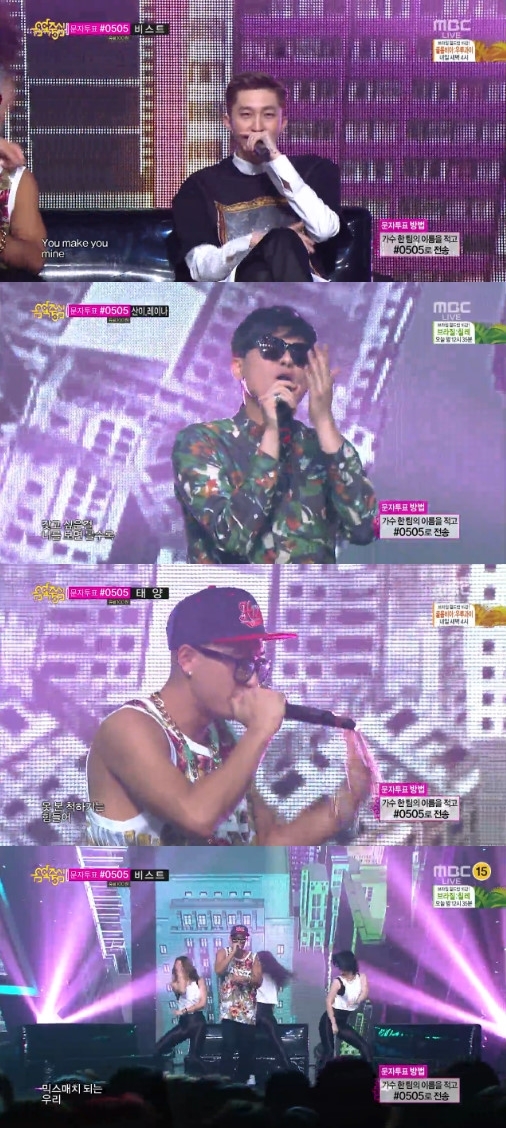한편, 이날 '쇼! 음악중심'에는 비스트, 제국의 아이들, 인피니트, 케이윌, 플라이투더스카이, 언터쳐블, 체리필터, AOA, 갓세븐, 보이프렌드, 유키스, 산이-레이나, 마마무, 히스토리, 타히티, 탑톡, 단발머리, 헤일로 등이 출연했다.