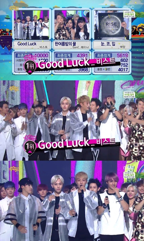 비스트는 28일 오후 방송된 MBC 음악 프로그램 '쇼! 음악중심'에서 산이-레이나 ‘한여름밤의 꿀’과 태양 ‘눈,코,입’을 제치고 ‘굿럭’으로 1위에 오르는 기염을 토했다.