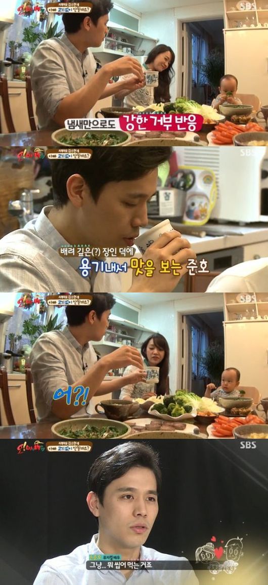 손준호는 28일 오후 방송된 SBS 예능프로그램 '오 마이 베이비'에서 처가에서 식구들과 함께 식사하며 건강을 우해 고기가 아닌 두부, 우엉차를 먹었다.